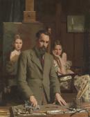 artists (visual artists) beards brown (colour) men (male humans) paintbrushes sitters suits (main garments) three-quarter-length figures