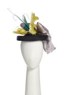 Navy pedal straw trimmed with grey satin ribbon, yellow and blue feathers in the style of 1894-97.