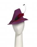 Purple quilted 'alpine' style hat trimmed with grosgrain ribbon and green, red and black cone of feathers at front.