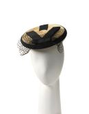 Bone pedal straw trimmed with black grosgrain ribbon and bow in front, coarse black veiling at front.