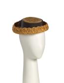 Straw miniature hat with brown grosgrain ribbon band forming bow at front