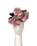 Black felt trimmed with pink satin ribbin band forming bow and two pink imitation roses at front in the style of 1894-1897.