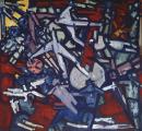 Tapestry executed in multi-colours with a bold abstract pattern, cartoon designed by Roger Kemp based on his paintings from 1960-1965.