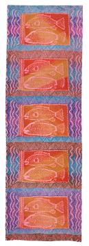 Design after an ochre painting on canvas by the artist. Ochre, turquoise and violet design on a pink ground with repeat pattern of large pairs of baramundi fish.
