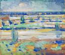 Impressionistic fields with vegetation, in white, blues, greens.