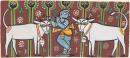 "Krishna as Cowherd". Krishna playing flute, flanked by two white cows. Stylized trees and flowers.