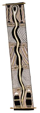 Djalu Gurruwiwi is a prominent yidaki craftsman and bark painter of the Galpu people. The Galpu are a clan of the Dhuwa moiety and one half of what constructs the Yolŋu world (the other being the Yirritja). Wititj, the olive python, is a connective link between the clans of the Dhuwa moeity and is a reoccurring theme in Galpu designs. The Wititj traversed the Country of the Galpu peoples during wangarr (ancestral) times, bringing storms and monsoon rains. While travelling, the Wititj would cross on land, underwater or through underground networks, connecting these three realms. The incandescent colouration of the background is called djarri, (rainbow colours). The Wititj’s elongated body stretches down the bark panel, representing the sandy path it carves out of the landscape as it travels. Speaking of the omnipotence of the Wititj, Djalu once explained: ‘We are all Wititj people. All these people come together for a good event and help each other in friendship. When I go out that way, maybe they call, ‘Wititj coming! Wititj, welcome home!’