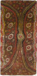 Fabric length of silk satin, decorated overall by batik. The main ground of brown contrasted with orange, gold and white in a free flowing intricate abstract desgin.