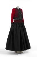 A three piece ensemble comprised of a black silk skirt with a red velvet yoke, and a red velvet bolero both embroidered and trimmed with black, jet beads, silk embroidery, braid, and tassels. The black silk chiffon ‘peasant’ blouse is also trimmed with black jet beads.