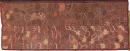 Fabric length, batik on silk, golden brown background divided into network of dividing lines and spaces filled with patterns in orange, ochre and white. 2 pieces joined across the centre.