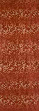 Fabric length of rust coloured shot dupion silk screenprinted with design in dull pink depicting Mimi figures in various poses.