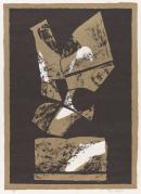 A textured, abstract form which is centrally placed against a black ground, surrounded by a gold border.