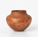 This thrown terracotta pot has had a treatment called multi-smoked firings. With multi-masking and reblocking using masking tape, clay and jute. Latham has built up a block style pattern over the five firings.