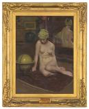 Like other paintings of artists' studios, this one gives us a glimpse, among other things, of framed paintings on the wall. The frame on the back wall, seen in the upper left, reflects the style of frame used by Bernard Hall and others, in the 1880s and 1890s, a style of frame which may have origins in the frames designed by Edgar Degas.