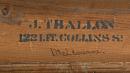The maker is identified by a stencil directly onto the wood on the reverse of the frame, centre bottom, an unusual means of identification by Thallon. The painting appears in this frame in a photograph of the Loan Exhibition of Australian Art at the National Art Gallery of New South Wales (later the Art Gallery of New South Wales), Sydney, April 1918. A frame with the same profile but smaller sight dimensions appears in Thallon’s ledger in an entry for B. Hall, 28 November 1902. The basic form of this frame appears on a number of paintings in the collection over a period from 1896 to 1906, with slight variations in dimensions, treatment of the sight edge and veneering of the frieze. See also the entry for J. C. Waite’s Alfred Felton, 1905 (245–2), also framed by Thallon in this style.
