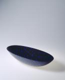 A canoe-shaped dish in opaque, fused glass with ovoid, ultramarine blue elements fused within a dark matrix which, in transmitted light, appears as a deep claret wine colour. The surface is finely ground throughout and the base retains its original paper label.