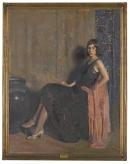 ceramic ware (visual works) cigarette holders (personal equipment) dresses (garments) evening dresses (garments) seated figures shawls shoes (footwear) women (female humans)