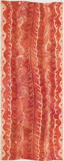 Design of musical rhythms and tones of rose red, the flowing lines of vegetal forms feature streaks, tendrils, circles and meanders.