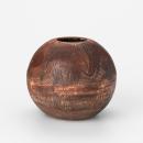 Spherical pot with incised designs of bird life and swaying human figures.