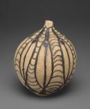Round pot to hold one flower, inspired by the form of a seed pod. Incised with linear vegetal motifs, infilled with oxides.