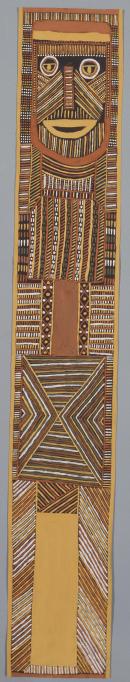 Depicts grave post with the head of Purukuparli, the major Tiwi ancestor. Both the post and the background are boldly painted with lines and dots.