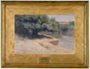 The frame appears in the Thallon ledger under an entry for the National Gallery of Victoria in 1898: Mar 20, National Gallery. Preparing and gilding 1 frame 3ft 7 x 2ft 9, 51/2, ‘Under a Summer Sun’ £1-14. The dimensions correspond to the outside dimensions of the frame. Like the entry for Arthur Streeton’s ‘The purple noon’s transparent might’ (33-2) and David Davies’ Moonrise (p.402.5-1), this one may be descriptive of finishing or re-finishing rather than the making of the frame. The cost re-enforces this idea. The frame was refitted to the painting in 1985 after being found in storage. It is one of a number of wide-format frames, which have been re-established with their paintings and thus reflect a taste that might otherwise have been lost. See also the frames on Tom Roberts’ The Sunny South (1078-4) and John Longstaff’s Gippsland, Sunday night, February 20th,1898 (48-2) among others.