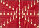 Board covered in red towelling fabric applied in Union Jack format with 41 white wax heads on ropes attached in Union Jack format.