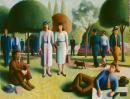 gardens (open spaces) leisure men (male humans) parks (public recreation areas) seated figures trees walking women (female humans)