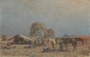 camp sites (recreation spaces) carriages (vehicles) equestrians horse (species) men (male humans) swags (camping equipment) tarpaulin travellers (people by activity)