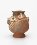 Handcrafted storage jar, conical shaped, deocrated with human faces protruding. Traces of pigments.