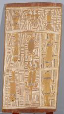 The artist shows two freshwater goanna emerging from a sacred well created by the Djang'kawu. The horizontal bands patterned with diagonals represent overflowing water covered with wild banana leaves. The dots in the upper section also represent water flowing between waterholes. The Djang'kawu saw fish in this locality and sang about them, making them sacred to the Ngaymil clan.