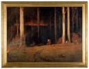 The scale of the frame is bold and no longer commonly seen on paintings from the time.2 Few frames of this type remain on major works. The frame appears in the ledger under Longstaff’s name, suggesting a direct relationship between the painter, the painting and the frame – a relationship that became apparent when the painting was returned to the original frame format. The frame allows the painting a level of grandeur, while focusing attention on the drama of the subject. As with Arthur Streeton’s ‘The purple noon’s transparent might’ (33-2), Longstaff’s Gippsland, Sunday night, February 20th,1898 had been reframed in a ‘Whistlerian’ frame around 1941.