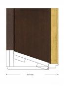 The original frame is made from a wide plank of softwood joined at an angle to an outer section made up from the lamination of two boards. The wide flat and the leading edge of the outer section are veneered with a very thin layer of white oak, which is interleaved with a layer of paper. The angled flat was glued and skew-nailed into the outer section before the veneer was attached. This is a method of construction which, on the one hand, is simple and economical and, on the other, implies certain difficulties in the process. Clearly it would be simpler to veneer the flat sections before cutting and fitting the frame together. The intersection of the flat section and the outer section is supported with blocks glued in place. The slip is similarly supported with blocks at the rebate. The slip is missing from what we have left of the frame but from old photographs it appears that it was a gilded surface. The veneered section appears to be stained.