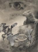 Depicts combined photocopied images with highly detailed but abstracted landscape forms and extracts of text transposed from the writings of William Blake, Nietzsche and classical authors.