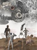 Depicts combined photocopied images with highly detailed but abstracted landscape forms and extracts of text transposed from the writings of William Blake, Nietzsche and classical authors.