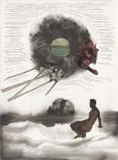 Depicts combined photocopied images with highly detailed but abstracted landscape forms and extracts of text transposed from the writings of William Blake, Nietzsche and classical authors.