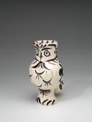 Vase in the shape of an owl, its elements having been developed as thrown forms, with the ovoid body set on an angle on a pedestal foot, the vase decorated in underglaze brown and black on white, and with sgraffito details, to represent the face, feathers and feet of the bird.