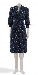 Dress of navy blue silk with pale green polka dots. Open neckline with wide collar lapels at the shoulder, sloping into a plunging V which finishes at the waistline. Side zip fastening with a broad soft-pleated sash fixed at the waist with a further draped sash dropping vertically from the waist to below the hem. Blouse style sleeves gather at the plain wristband. Shoulder pads and a lined skirt section.