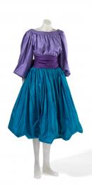 Peasant style blouse of lilac silk taffeta with wide round neckline which is lower at the back. The body of the blouse and sleeves are very full, gathering from the neckband and shoulders, narrowing at the wrist, fastened by a single lilac coloured button. Single stitched welted seams run the length of the left and right front and centre back. The puff-style harem skirt of aqua silk taffeta has a cream organza lining from the inside waist to the halfway point where it joins the gathered and turned up hem of the skirt. The skirt fastens at the side with a zip and a single button at the waistband. The long sash is of a heavier purple silk and is widest at the centre, tapering off at both ends, cut on the cross in 3 sections, with join seams running diagonally.