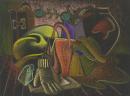 Depicts a series of objects from the artist's bedroom which are drawn in rich, brightly coloured pastels on black paper. " This composition of objects chosen for variations in shape, colour and texture was done as a homework for Bell. The central arrangement of hat, handbags, gloves and newspaper is piled up on bare floor-boards which lead the eye back to the suitcase in the upper left and across to the vases on the right. The red heart on the black vase was invented to stop the corner from receding into depth." (Felicity St
