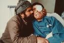 typed on accompanying paper label: MICHAEL COYNE / A Kurdish shepherd hugs his fourteen-year-old blind son who had stepped on an / Iranian mine. The father, who sold most of his property to bring his son to / Tehran, offered his eyes but the boy was to badly injured for a transplant.
