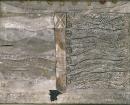 wood, hessian, canvas, fibre, synthetic polymer paint, polyvinyl acetate glue and sand on canvas