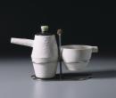 Two porcelain jugs made by the artist held in a recycled stainless steel cruet. One of the jugs has a recycled Bakelite and plastic lid.