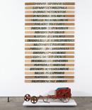 polyvinyl chloride and decal lettering on aluminium on wood, eye hooks, billycart, hessian sack