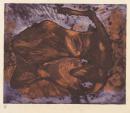 Printed in shades of vibrant orange and purple, this image depicts the contorted form of a cow, victim of the savage drought which killed thousands of cattle in Australia during the early 1950s
