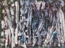 Consists of broadly brushed, textured white markings on a black and dark red ground.