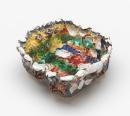 A square deep sided bowl on four feet. The sides and base decorated with shell moulded motifs and glazed in imitation of a rock pool.