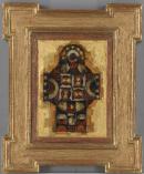 Painted after a study tour of Asia, French was turning to Byzantine art for both subject and technique. He has simplified the cross into a modernist design related to the style of Leger and used layers of glazes, red, brown palette and gold leaf to make painting and frame into the work of art.