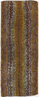 The design consists of olive green, brown and black curvilinear and tendril motifs flowing parallel to each other on a white ground. The presence of areas of white and a network of black cracks enlivens the design.