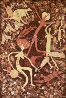 The artist depicts Quinkan spirits, macropods, fruit bats, fish and other creatures inspired by the rock art of far north Queensland. The palette consists of red ochre, white and lemon yellow on a dark brown ground.